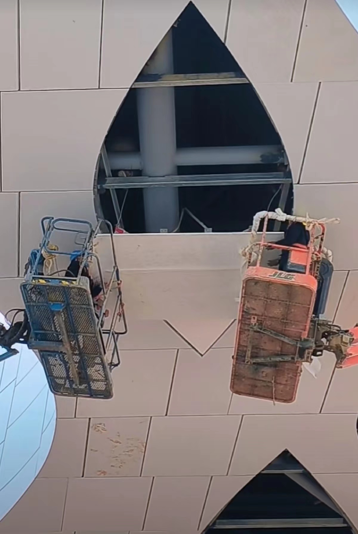 “高空秋千”_亚克力的安装首先要考虑人员的安全,其次要考虑产品的安全,最终才是设计效果的完美体现,这才是施工人员的基本思路,千万不要忘了,这是在荡秋千哦!#大玻璃 #高空作业 #亚克力安装 #高空秋千 #体育馆@亚克力有机玻璃-中联 @亚克力有机玻璃 @喜兔亚克力应用